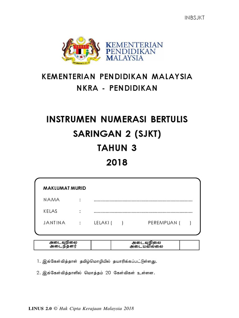 Instrumen Numerasi Bertulis Sjkt Saringan 2 Thn 3 2018 Pdf