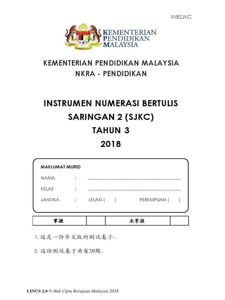 Instrumen Numerasi Bertulis Sjkc Saringan 2 Thn 3 2018 Pdf Pdf
